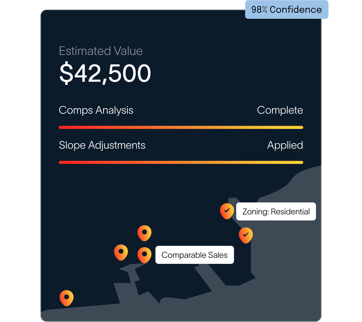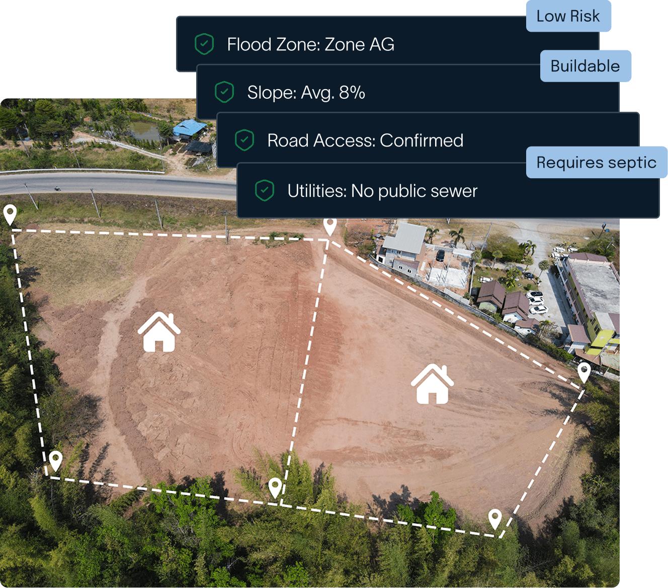 Slope, flood zones, access, utilities, zoning. We automate the heavy lifting so you can focus on the decision. It’s the perfect blend of AI speed and investor control—no more juggling multiple tools or hunting through county records.