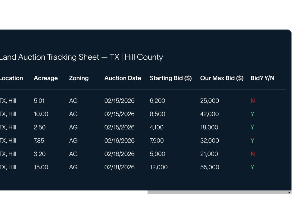 Rapidly underwrite large numbers of parcels, identify red flags early, and walk into auctions with conviction, not guesses.