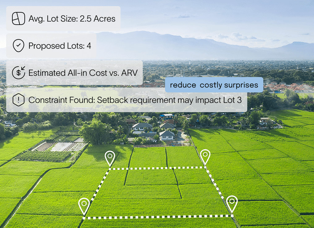 Analyze parcels beyond surface level comps. Understand constraints early and price lots more intelligently to reduce costly surprises.