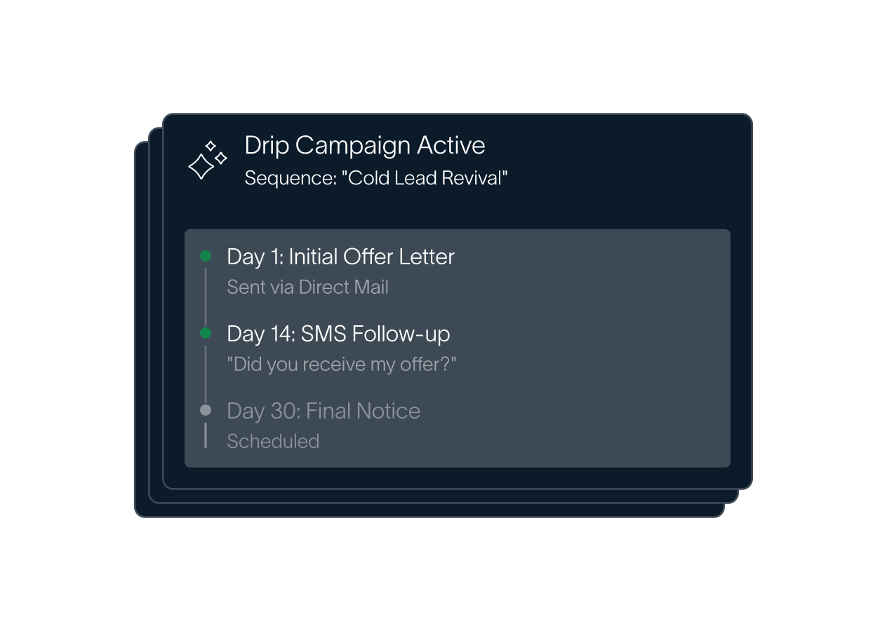 Automate your follow-up with multi-channel drip campaigns. Send letters, texts, and emails automatically based on where the lead is in your pipeline.