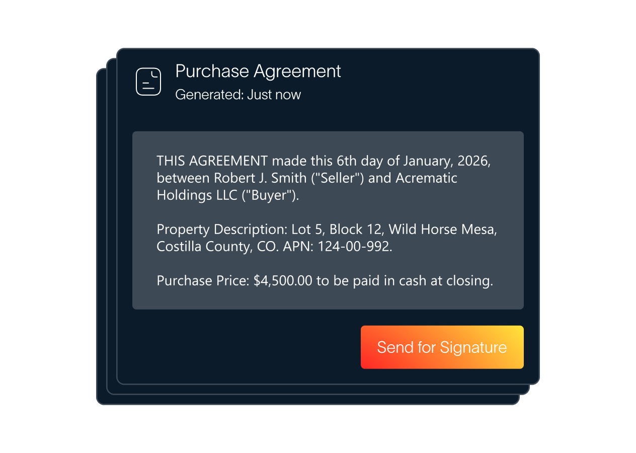 Streamline your deal closing process by generating purchase agreements, deeds, and contracts in seconds. Our system auto-fills legal descriptions, APNs, and owner names directly from county records, eliminating manual errors and saving valuable time. Seamlessly integrate with e-signature platforms for quick and efficient document execution.